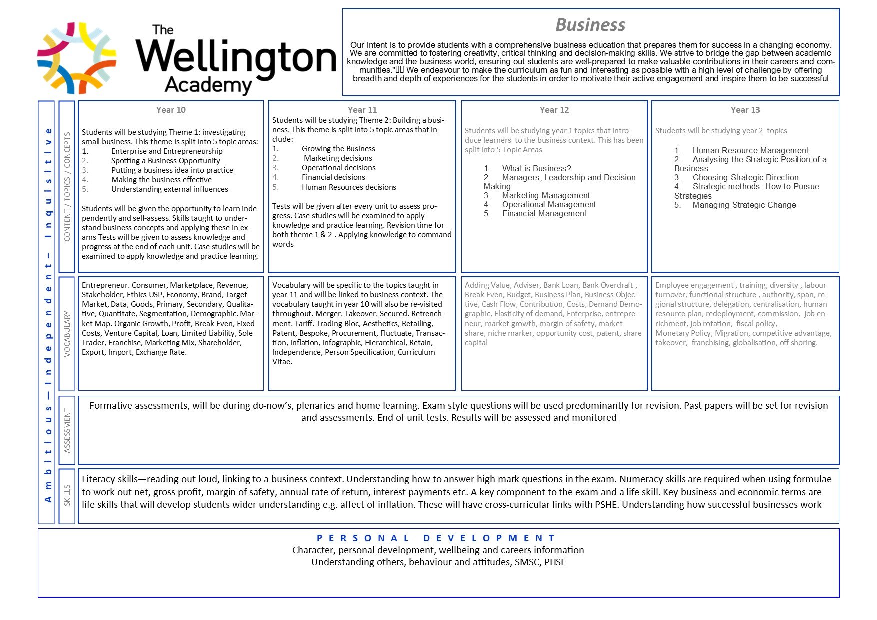 Our intent is to provide students with a comprehensive business education that prepares them for success in a changing economy. We are committed to fostering creativity, critical thinking and decision-making skills. We strive to bridge the gap between academic knowledge and the business world, ensuring out students are well-prepared to make valuable contributions in their careers and communities. We endeavour to make the curriculum as fun and interesting as possible with a high level of challenge by offering breadth and depth of experiences for the students in order to motivate their active engagement and inspire them to be successful.