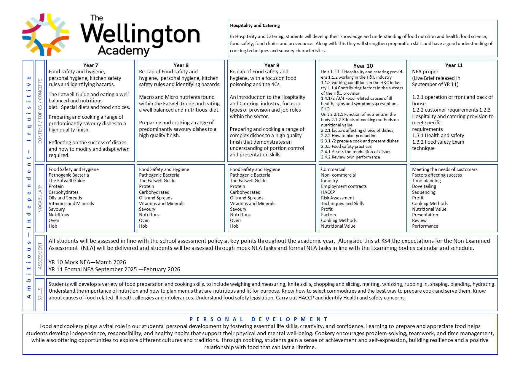 In Hospitality and Catering, students will develop their knowledge and understanding of food nutrition and health; food science; food safety; food choice and provenance. Along with this they will strengthen preparation skills and have a good understanding of cooking techniques and sensory characteristics.