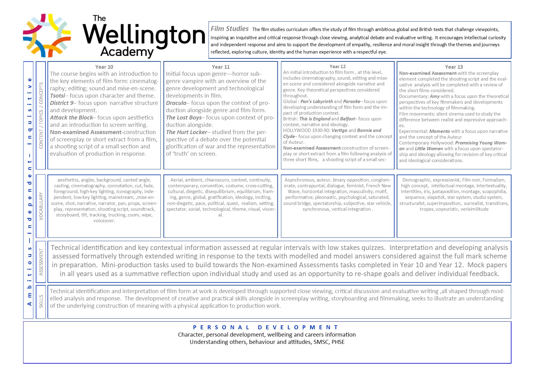 The film studies curriculum offers the study of film through ambitious global and British texts that challenge viewpoints, inspiring an inquisitive and critical response through close viewing, analytical debate and evaluative writing. It encourages intellectual curiosity and independent response and aims to support the development of empathy, resilience and moral insight through the themes and journeys reflected, exploring culture, identity and the human experience with a respectful eye.