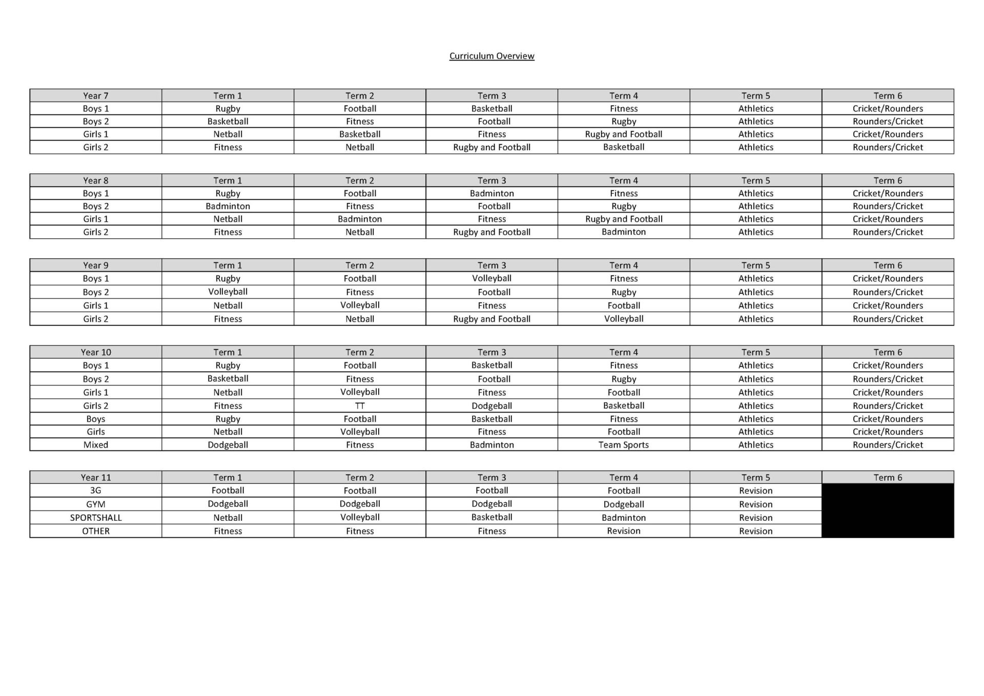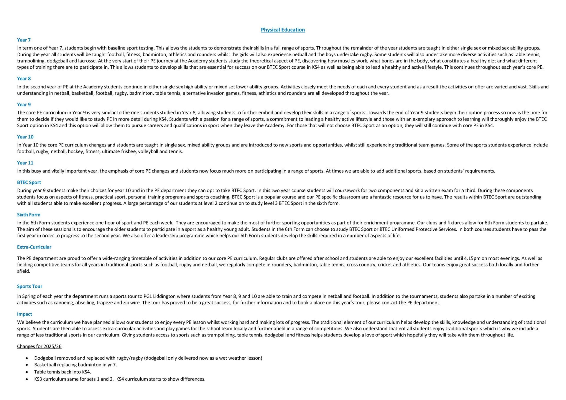 The expectation of all students in the PE department is to Work, Learn and Enjoy. As staff we are very proud of the curriculum we have developed, both in lessons and beyond and we continually strive to develop the PE provision available at the Academy. We are extremely fortunate to have the facilities we have, and we make use of these within curriculum time and during extra-curricular activities. Our KS3 curriculum builds the foundations required to be successful in a range of sports. It is our intent that all students will go on to study BTEC Sport at KS4 and KS5 and our curriculum is designed to facilitate that progression. For those students not studying BTEC Sport our intent is to install a lifelong love of sport and recreation and show students the benefits of a healthy active lifestyle. It is expected that all students, regardless of pathway, grasp the opportunities provided to them and do so with an outstanding approach to learning. This includes being fully prepared for all lessons. Our PE kit is available to order from Stitch-a-logo